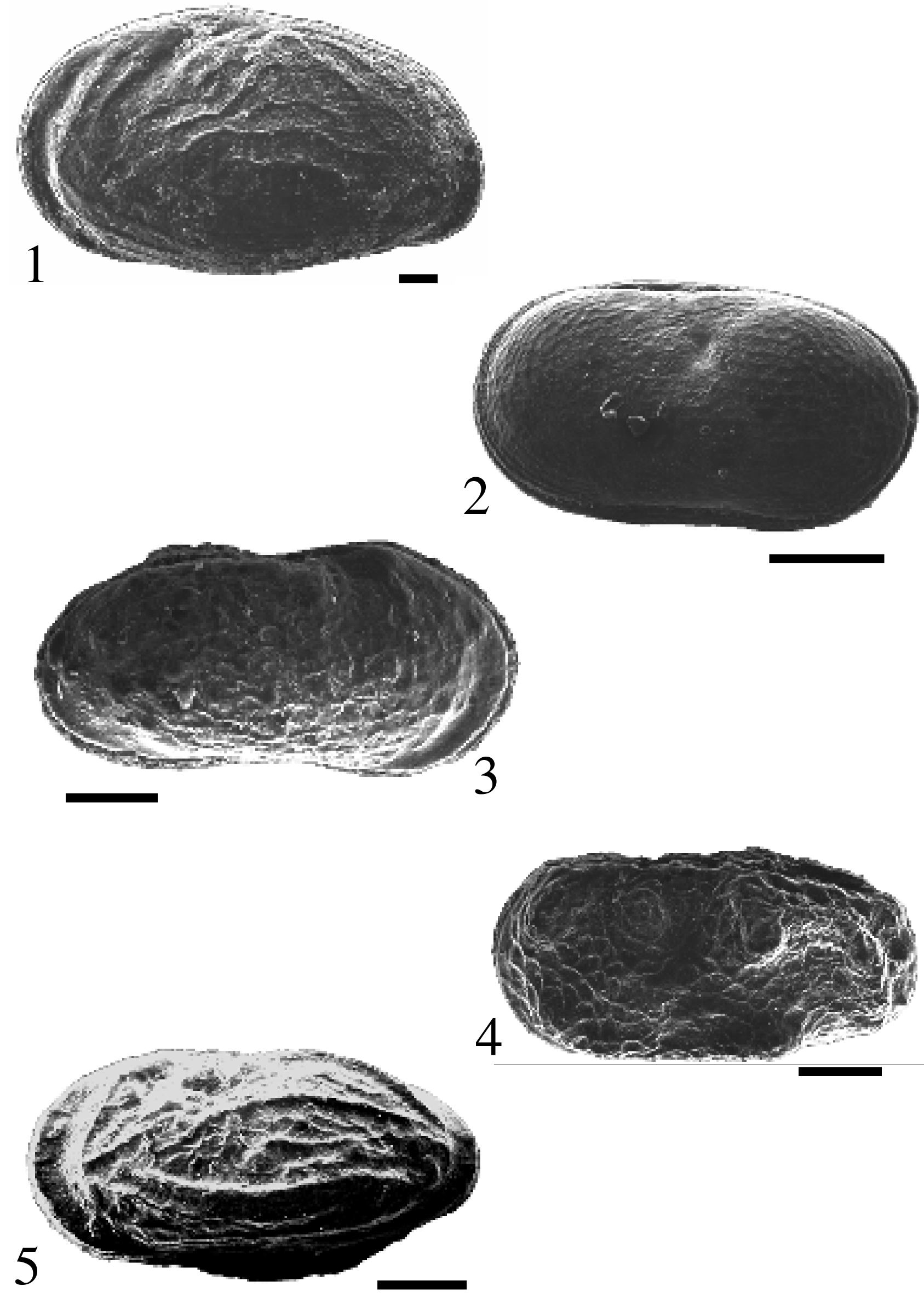 5. Pontocyprella fabaeformis (DREXLER, 1958): BEHER (2004) beschreibt diese Art aus dem Sinemurium und Unter-Pliensbachium von Süddeutschland und Nordschweiz. Dies entspricht der bei HARLOFF (1993) angegebenen Verbreitung. Desweiteren wird sie aus dem Hettangium (RIEGRAF, 1985) und dem Ober-Pliensbachium von Nordeuropa (CHRISTTENSEN, 1968, MICHELSEN, 1975; SIVHED, 1980) beschrieben. Im Tethysraum kommt sie ebenfalls von Hettangium bis Ober-Pliensbachium vor (HARLOFF & JÄGER, 1994; JÄGER, 1997), auf Sizilien im höheren Ober-Pliensbachium (BARBIERI, 1964).