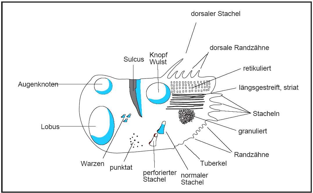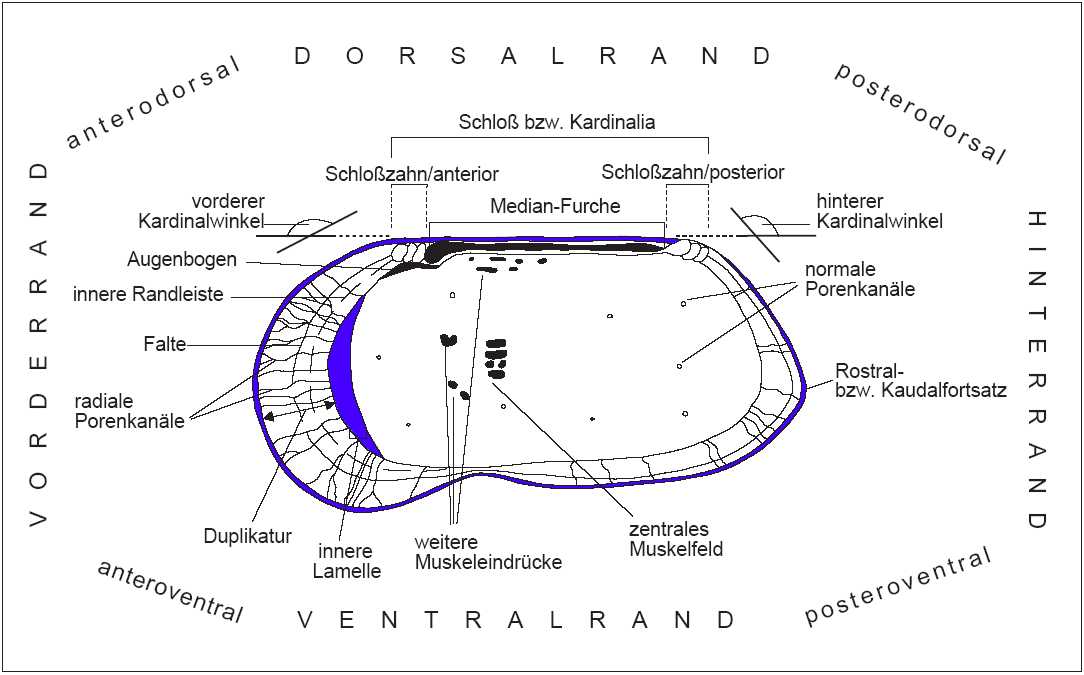 In Abb. 6 werden am Beispiel einer schematisch dargestellten Klappe einer mesozoischen Ostracode die wichtigsten terminologischen Begriffe erläutert. Der Begriff Kardinalwinkel wird häufig in der Literatur durch Dorsalwinkel ersetzt, wobei der vordere und hintere Dorsalwinkel dem vorderen und hinteren Kardinalwinkel entspricht. Das Vestibulum ist ein freier Raum zwischen äußerer und innerer Lamelle. In Abb. 7 sind die wichtigsten Skulpurelemente dargestellt.