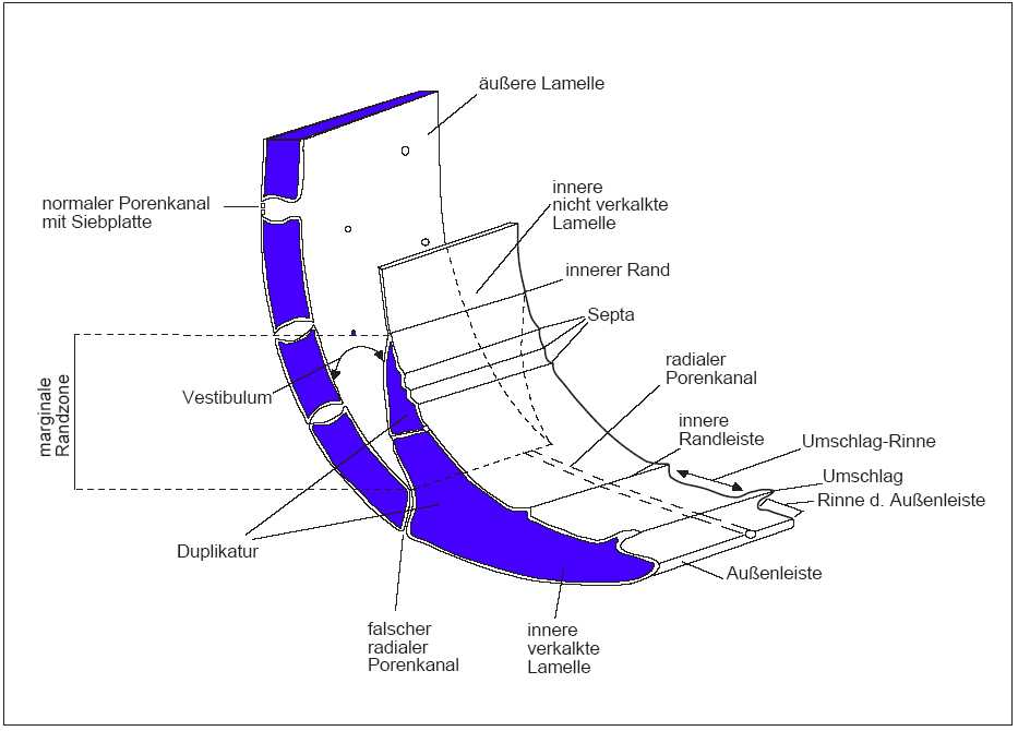 Das Ostracodengehäuse besteht aus zwei an den Schalenrändern zusammenhängenden Schalenblättern. Sie werden als Außen‑ und Innenlamelle bezeichnet (Abb.2). Nur die Außenlamelle ist in ihrer ganzen Breite kalkig ausgebildet, weshalb sich folgende Ausführungen auch nur auf diese beziehen.